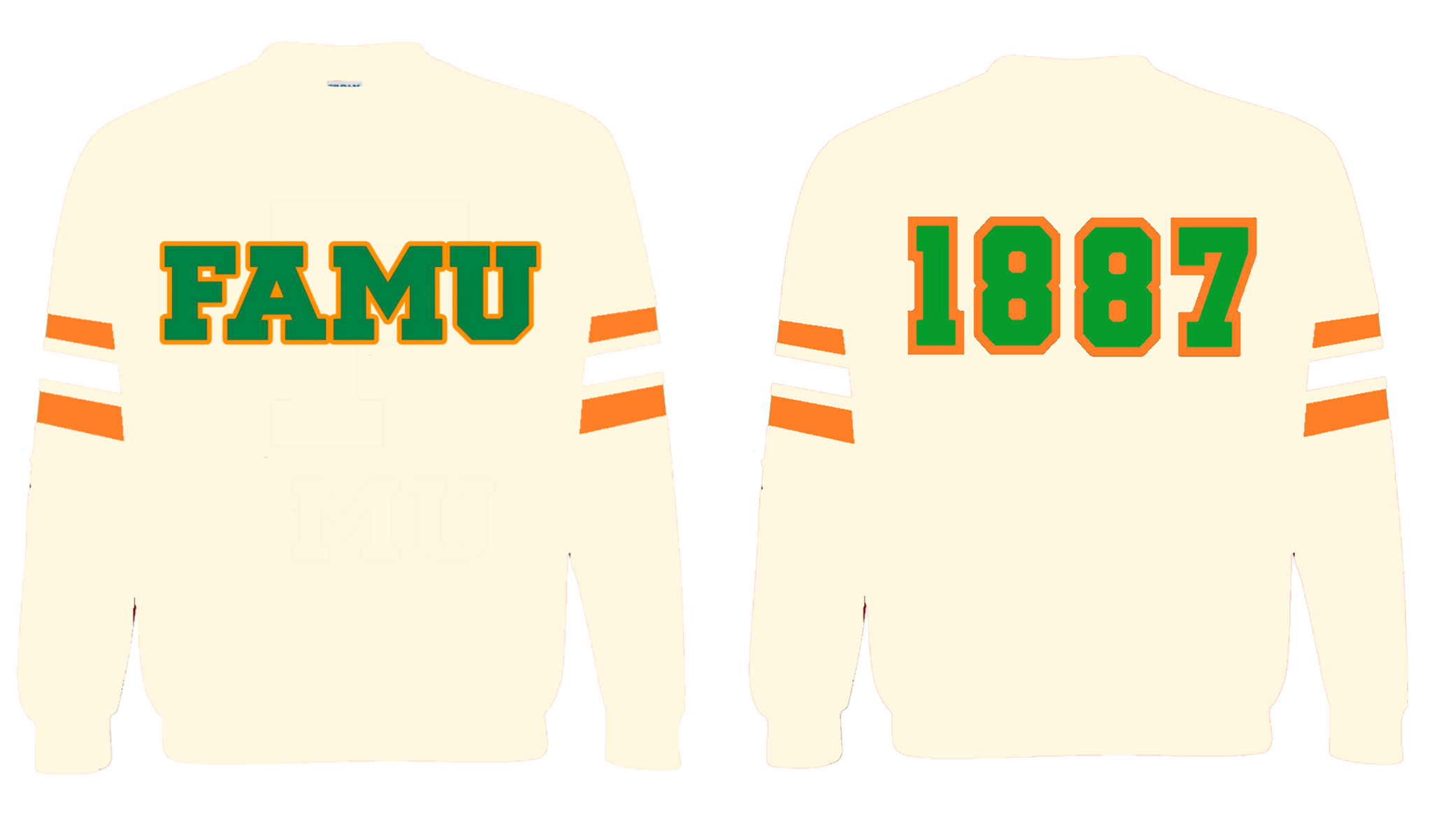 Sweaters are made of a cream colored cotton, with FAMU in a Green chenile patch. On the back is a Green chenile patch of "1887